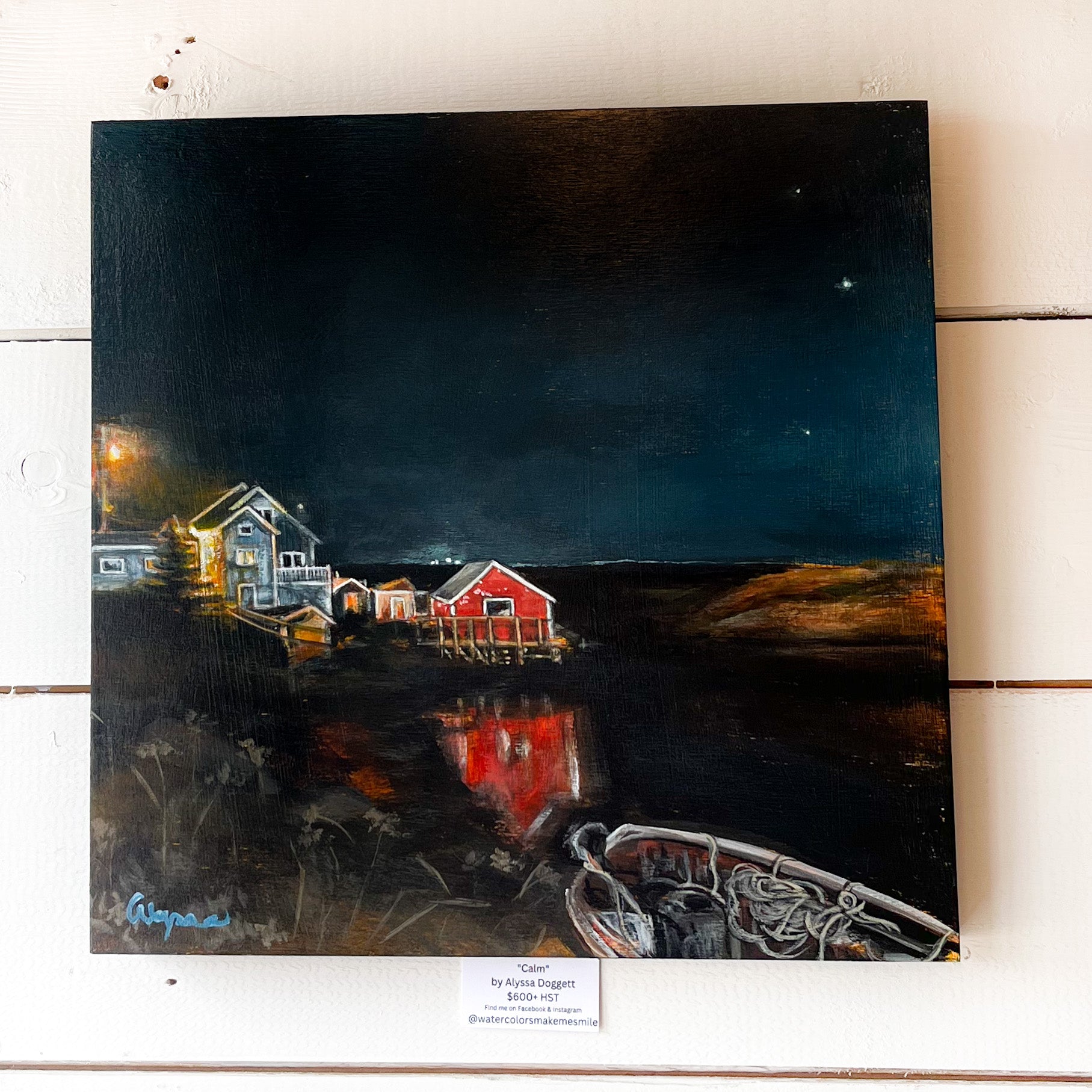 The homes and fishing village on the coast of Peggy's Cove. Painted with the focus of capturing the feeling of serenity felt on the night I stood before it in person. Acrylics painted on 12x12 gallery panel, sealed with professional varnish.