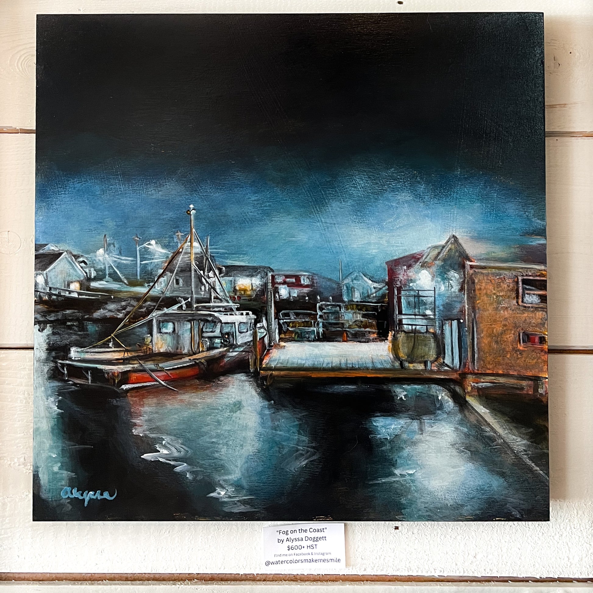 Painted to capture the glowing fog escaping into the dark sky and reflecting onto the water surrounding the boats docked at Peggy's Cove Fishing Village. Acrylics painted on 12x12 gallery panel, sealed with professional varnish.