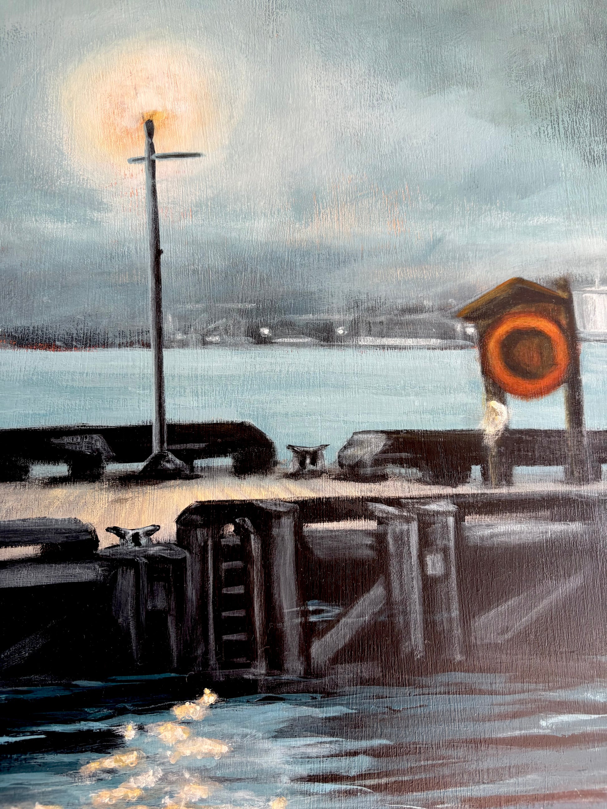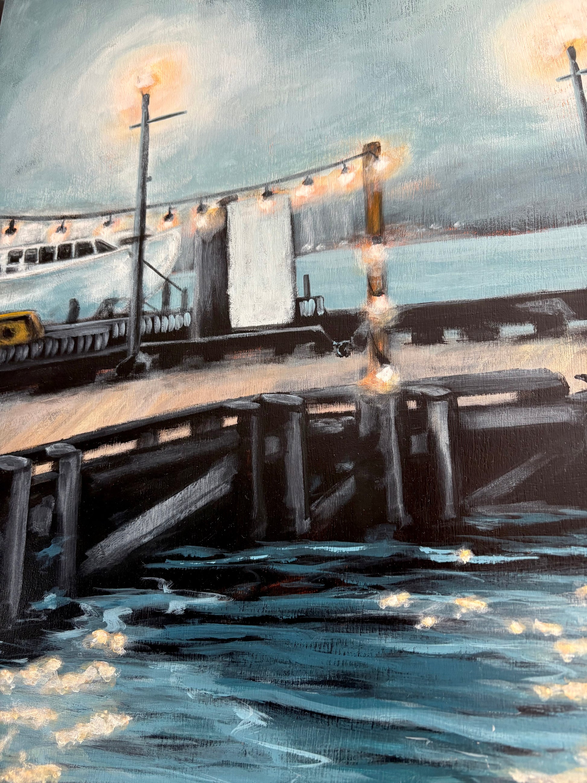 Halifax boardwalk and Harbour reimagined from a calm evening walk on the lit up boardwalk. Painted with acrylics on a 24x36 birch gallery panel. Captured from a calm evening walk on the lit up boardwalk.