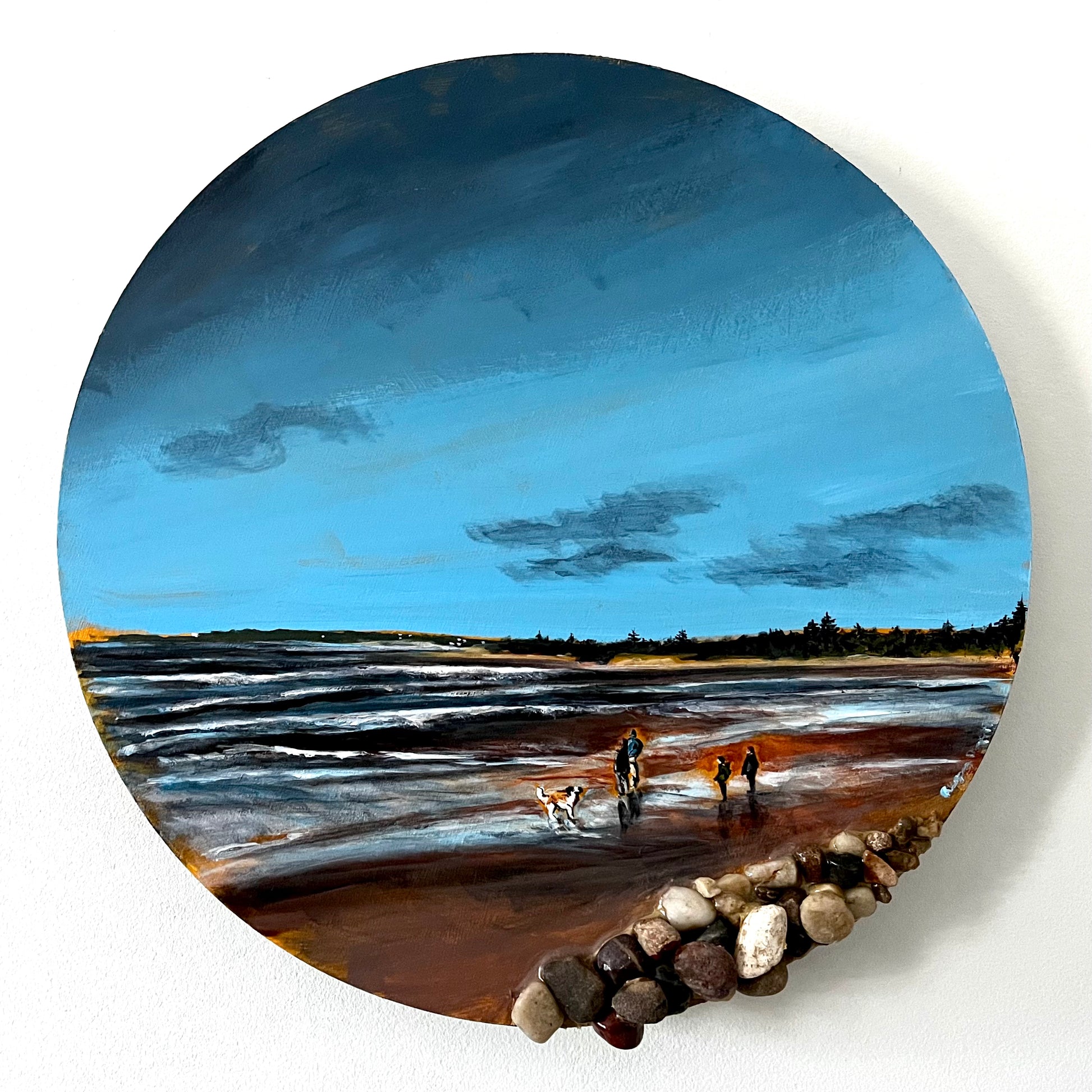 Painted from a photo I took of a family and their dog enjoying a walk down Lawrencetown Beach in December 2020. Acrylics painted on 14” round cradled birch panel, 1 3/4” deep. Embellished with beach pebbles to capture a true touch of the beach.