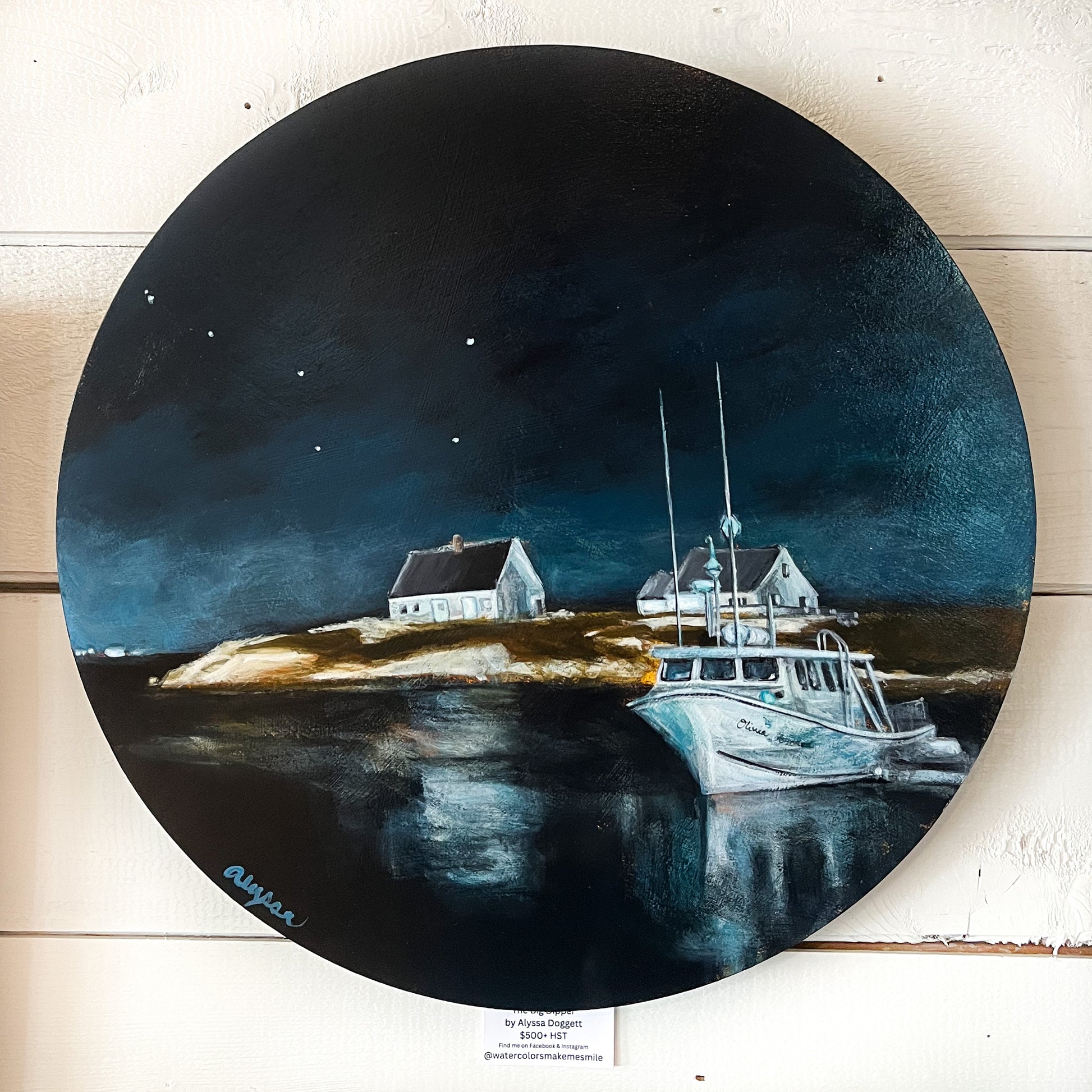 The Big Dipper was a fun surprise as I didn’t realize it was in my reference photo until I was painting the stars. Acrylics painted on 12” round gallery panel, sealed with professional varnish.